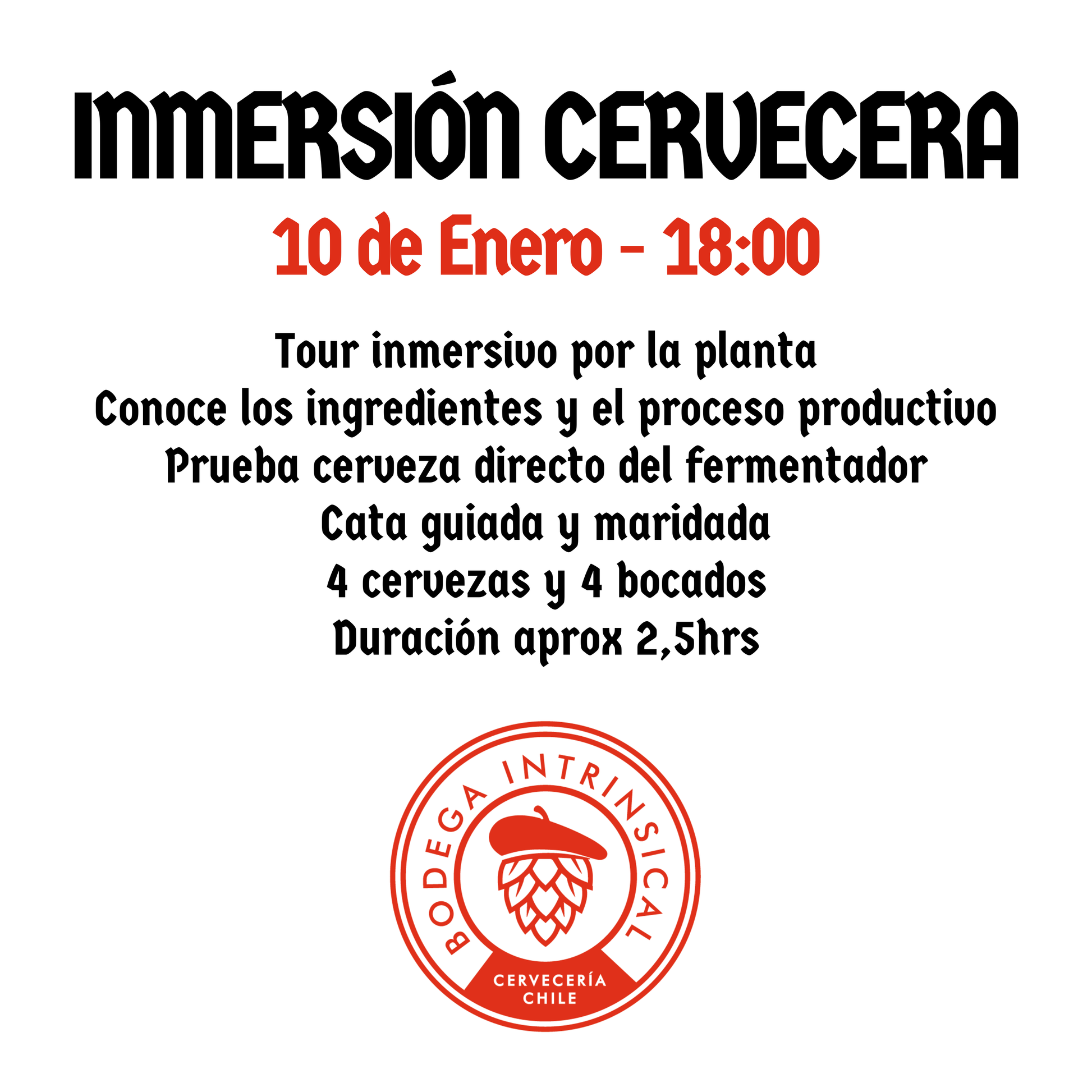 El Sábado 10 de Enero a las 18:00 haremos un tour inmersivo en nuestra planta de Santiago centro, probaremos ingredientes, revisaremos el proceso productivo, cataremos cervezas directo del fermentador y terminaremos con una cata guiada y maridada de 4 de nuestras cervezas,